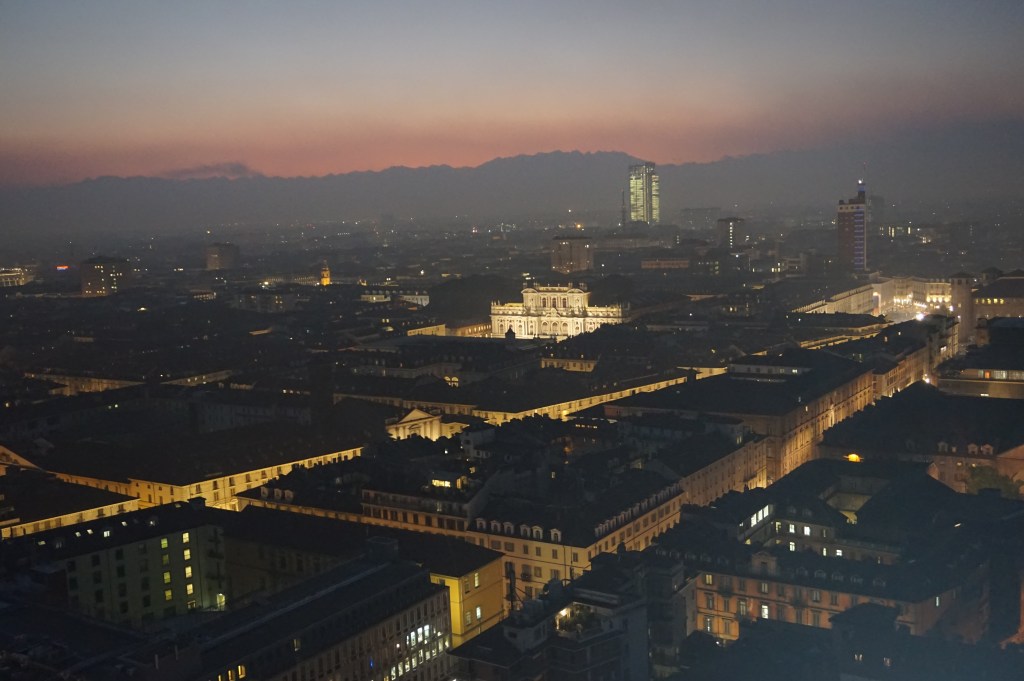 Après 7h de train, j’arrive à Turin en fin d’après midi. Le soleil allant bientôt se couché je décide de faire un tour au Mole. Ce bâtiment est vraiment superbe, je dirais que c’est un peu l’Empire state bulding de Turin. J’ai pris l’ascenseur pour profiter du couché de soleil sur la ville.