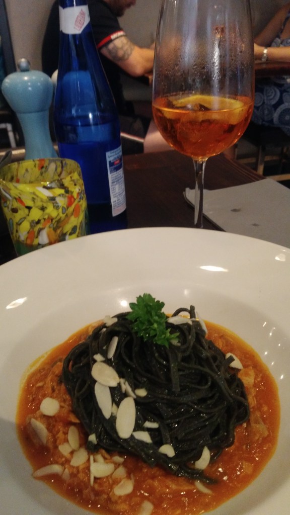 En apéritif les italiens adorent prendre un Spritz Apérol (photo du milieu). C’est un peu amer mais plutôt agréable.