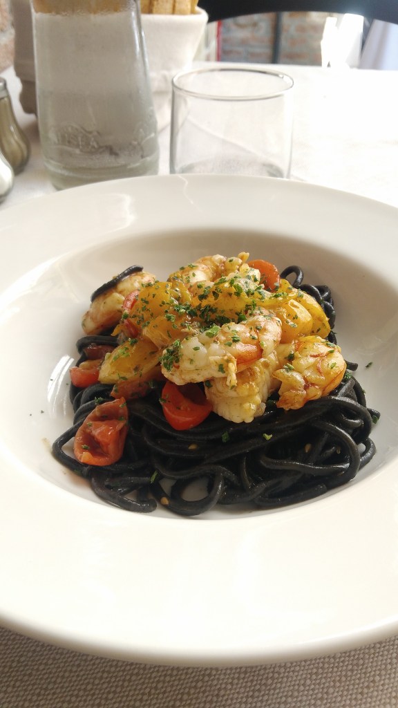 La grande spécialité du coin à tester: pâte ou polenta à l’encre de seiche.