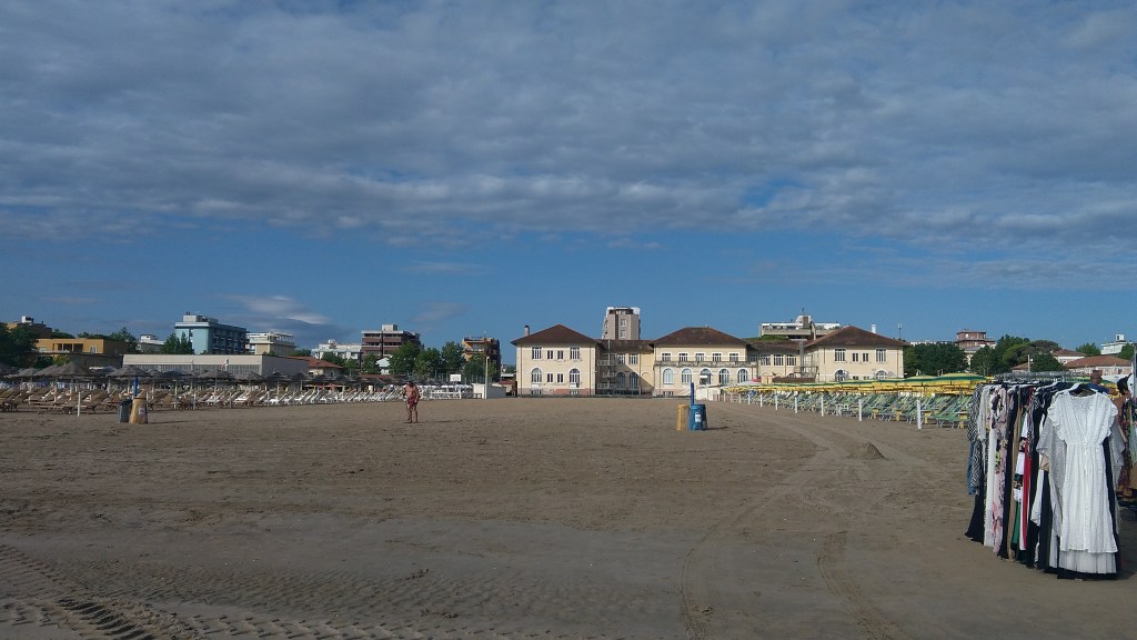 En tant que Française, j’étais habituée aux plages gratuites, placement libre où chacun fait ce qu’il a envie globalement. En Italie, la plage est très différente, la plus part des plages appartiennent à des hôtels et sont donc payantes. Il y a des sorte de mini complexe sur la plage qui proposent restauration, des vendeurs de vêtement, etc. J’ai parcouru presque 3km le long de la plage les pieds dans l’eau pour observer ça, c’est juste incroyable. Toute les plages proposent à différents horaires des cours zumba, de gym sur la plage etc. Tout est payant. Sauf se baigner heureusement! L’eau est plutôt chaude (c’est cool l’adriatique).