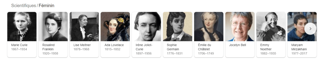 Quand on tape dans google femmes scientifiques, on obtient un bandeau avec a une cinquantaine de femmes.
