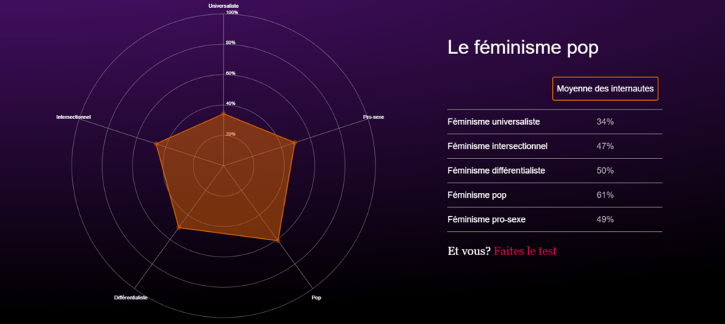 Lors de mes recherches sur les divers courants, j’ai découvert un site qui propose un test pour connaître quelle féministe nous sommes. Les résultats sont donnés sous la forme d’un diagramme en étoile. J’ai trouvé ce site intéressant, mais il manquait un petit quelque chose.