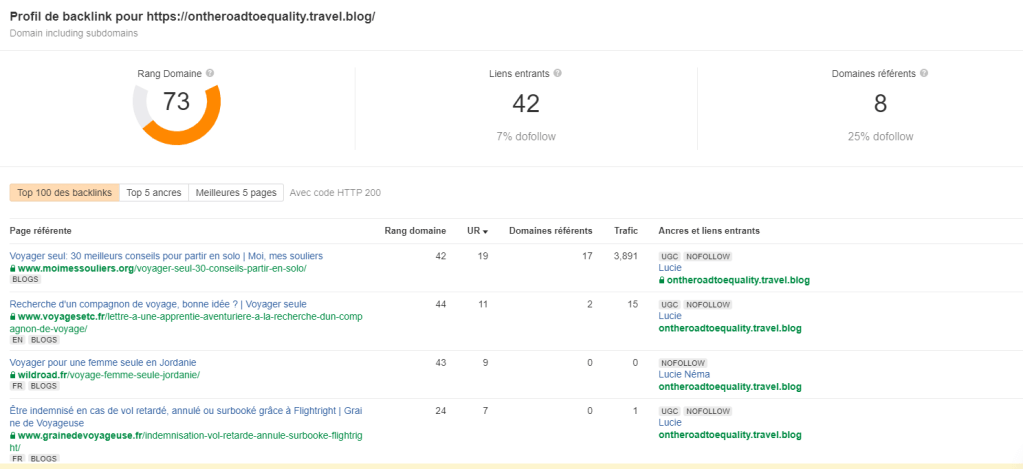 Le deuxième outil gratuit que j’aime bien utilisé c’est ahrefs. Il s’agit d’un procédé qui vérifie les « back link » les liens d’autres sites qui pointent vers votre blogue.  C’est intéressant de regarder votre site, mais aussi celui de personnes qui sont bien référencés dans Google.