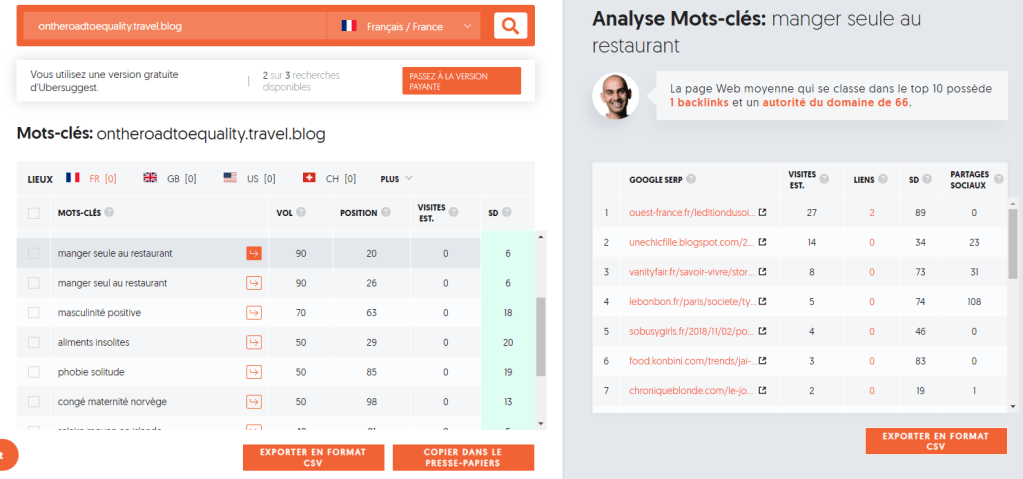 Enfin, le dernier outil que je trouve plutôt utile, mais qui est limité en version gratuite, c’est Ubbersuggest . Cet outil fait un audit de votre site et vous donne les mots clés de votre site, les back-link etc.