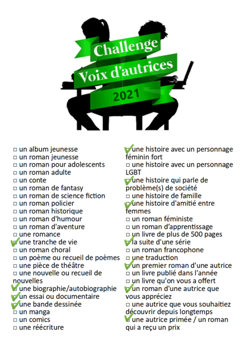 Cette année, j’ai décidé de participer également au Challenge voix d’autrices organisé par arcanesouvertes. Ce challenge à lieu toute l’année du 1er janvier au 31 décembre. Vous retrouverez toutes les informations concernant le challenge sur son blog.
